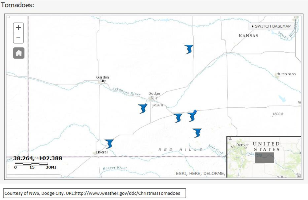 Christmas saw a rare outbreak of severe weather. In southwest Kansas, a squall line triggered several small brief tornadoes. According to the Dodge City National Weather Service office, there were 6 tornadoes that touched down. All tornadoes were rated as EF0, and tracks ranged from less than a mile near Kismet to almost seven miles southeast of Greensburg.
