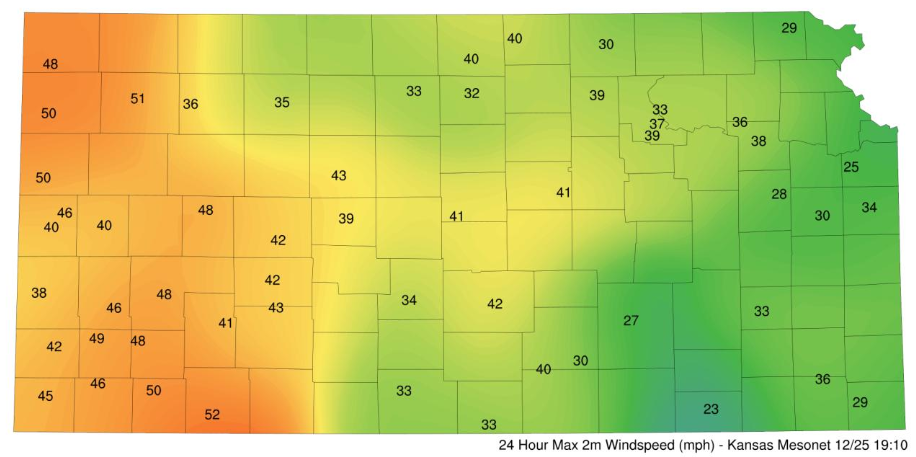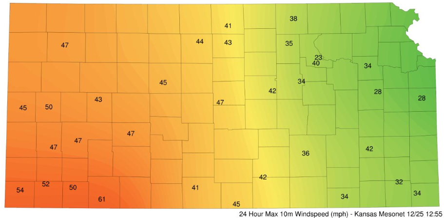 Kansas Mesonet recorded wind gusts as high as 52 mph at 6 feet above ground (2 meters), and 61 mph at 30 feet (10 meters). The recorded maximum gusts on the station network are plotted below.